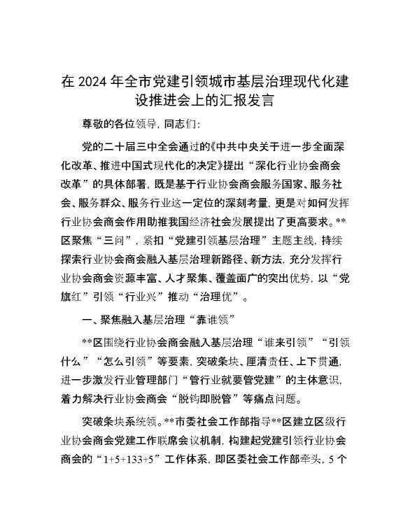 在2024年全市党建引领城市基层治理现代化建设推进会上的汇报发言 2024-10-15 Word模板 70 购买前,请一定要先点击这里看看,欢迎持续关注,精彩模板每天推送 预览结束,本文件为word文档,一共6页,共2362字,请购买后,下载后查看 购买前,请一定要先点击这里看看,欢迎持续关注,精彩模板每天推送 资源下载下载价格29 RMBVIP免费升级VIP点击检测网盘有效后购买有任何充值和下载问题请加微信:xuexixuexi66 0 演讲发言
