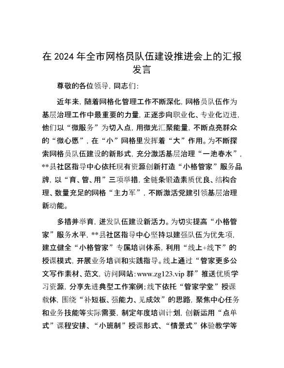 在2024年全市网格员队伍建设推进会上的汇报发言 2024-10-15 Word模板 64 购买前,请一定要先点击这里看看,欢迎持续关注,精彩模板每天推送 预览结束,本文件为word文档,一共3页,共1290字,请购买后,下载后查看 购买前,请一定要先点击这里看看,欢迎持续关注,精彩模板每天推送 资源下载下载价格29 RMBVIP免费升级VIP点击检测网盘有效后购买有任何充值和下载问题请加微信:xuexixuexi66 0 演讲发言