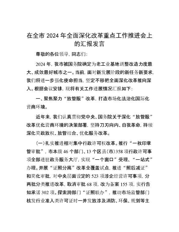 在全市2024年全面深化改革重点工作推进会上的汇报发言 2024-10-15 Word模板 68 购买前,请一定要先点击这里看看,欢迎持续关注,精彩模板每天推送 预览结束,本文件为word文档,一共4页,共1626字,请购买后,下载后查看 购买前,请一定要先点击这里看看,欢迎持续关注,精彩模板每天推送 资源下载下载价格29 RMBVIP免费升级VIP点击检测网盘有效后购买有任何充值和下载问题请加微信:xuexixuexi66 0 演讲发言
