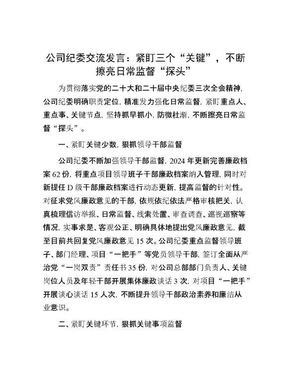公司纪委交流发言:紧盯三个“关键”,不断擦亮日常监督“探头” 2024-10-15 Word模板 68 购买前,请一定要先点击这里看看,欢迎持续关注,精彩模板每天推送 预览结束,本文件为word文档,一共3页,共1056字,请购买后,下载后查看 购买前,请一定要先点击这里看看,欢迎持续关注,精彩模板每天推送 资源下载下载价格29 RMBVIP免费升级VIP点击检测网盘有效后购买有任何充值和下载问题请加微信:xuexixuexi66 0 演讲发言