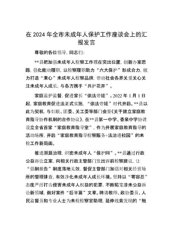 在2024年全市未成年人保护工作座谈会上的汇报发言 2024-10-15 Word模板 63 购买前,请一定要先点击这里看看,欢迎持续关注,精彩模板每天推送 预览结束,本文件为word文档,一共3页,共1104字,请购买后,下载后查看 购买前,请一定要先点击这里看看,欢迎持续关注,精彩模板每天推送 资源下载下载价格29 RMBVIP免费升级VIP点击检测网盘有效后购买有任何充值和下载问题请加微信:xuexixuexi66 0 演讲发言