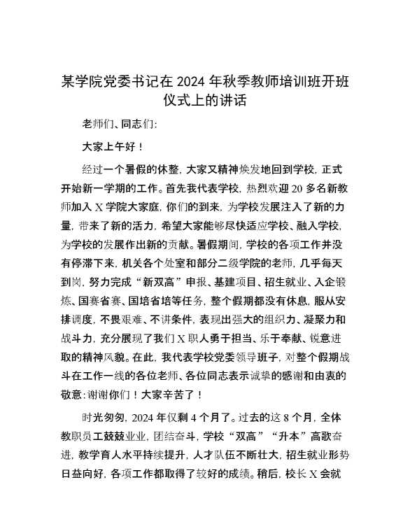 某学院党委书记在2024年秋季教师培训班开班仪式上的讲话 2024-10-15 Word模板 66 购买前,请一定要先点击这里看看,欢迎持续关注,精彩模板每天推送 预览结束,本文件为word文档,一共8页,共3821字,请购买后,下载后查看 购买前,请一定要先点击这里看看,欢迎持续关注,精彩模板每天推送 资源下载下载价格29 RMBVIP免费升级VIP点击检测网盘有效后购买有任何充值和下载问题请加微信:xuexixuexi66 0 演讲发言