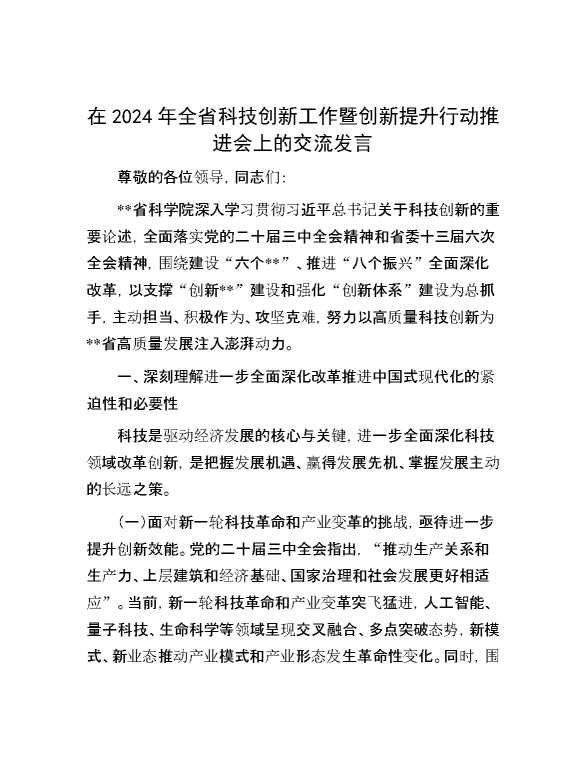 在2024年全省科技创新工作暨创新提升行动推进会上的交流发言 2024-10-15 Word模板 63 购买前,请一定要先点击这里看看,欢迎持续关注,精彩模板每天推送 预览结束,本文件为word文档,一共8页,共3669字,请购买后,下载后查看 购买前,请一定要先点击这里看看,欢迎持续关注,精彩模板每天推送 资源下载下载价格29 RMBVIP免费升级VIP点击检测网盘有效后购买有任何充值和下载问题请加微信:xuexixuexi66 0 演讲发言