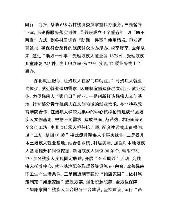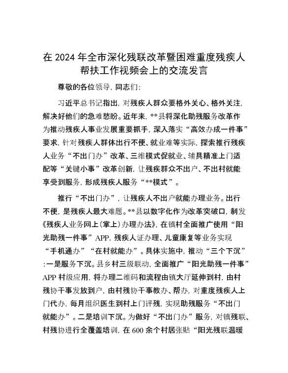 在2024年全市深化残联改革暨困难重度残疾人帮扶工作视频会上的交流发言 2024-10-15 Word模板 70 购买前,请一定要先点击这里看看,欢迎持续关注,精彩模板每天推送 预览结束,本文件为word文档,一共4页,共1957字,请购买后,下载后查看 购买前,请一定要先点击这里看看,欢迎持续关注,精彩模板每天推送 资源下载下载价格29 RMBVIP免费升级VIP点击检测网盘有效后购买有任何充值和下载问题请加微信:xuexixuexi66 0 演讲发言