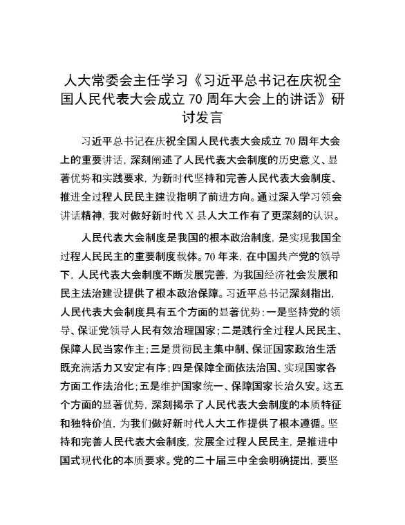 人大常委会主任学习《习近平总书记在庆祝全国人民代表大会成立70周年大会上的讲话》研讨发言 2024-10-15 Word模板 90 购买前,请一定要先点击这里看看,欢迎持续关注,精彩模板每天推送 预览结束,本文件为word文档,一共4页,共1803字,请购买后,下载后查看 购买前,请一定要先点击这里看看,欢迎持续关注,精彩模板每天推送 资源下载下载价格29 RMBVIP免费升级VIP点击检测网盘有效后购买有任何充值和下载问题请加微信:xuexixuexi66 0 演讲发言