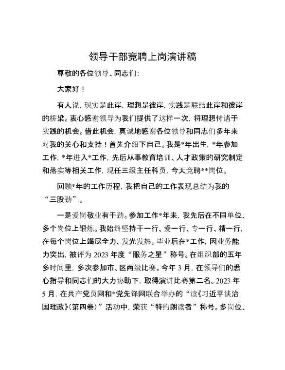 领导干部竞聘上岗演讲稿 2024-10-15 Word模板 96 购买前,请一定要先点击这里看看,欢迎持续关注,精彩模板每天推送 预览结束,本文件为word文档,一共3页,共1243字,请购买后,下载后查看 购买前,请一定要先点击这里看看,欢迎持续关注,精彩模板每天推送 资源下载下载价格29 RMBVIP免费升级VIP点击检测网盘有效后购买有任何充值和下载问题请加微信:xuexixuexi66 0 演讲发言