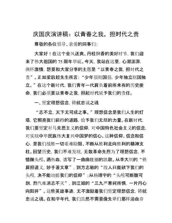 庆国庆演讲稿:以青春之我,担时代之责 2024-10-15 Word模板 137 购买前,请一定要先点击这里看看,欢迎持续关注,精彩模板每天推送 预览结束,本文件为word文档,一共4页,共1675字,请购买后,下载后查看 购买前,请一定要先点击这里看看,欢迎持续关注,精彩模板每天推送 资源下载下载价格29 RMBVIP免费升级VIP点击检测网盘有效后购买有任何充值和下载问题请加微信:xuexixuexi66 0 演讲发言