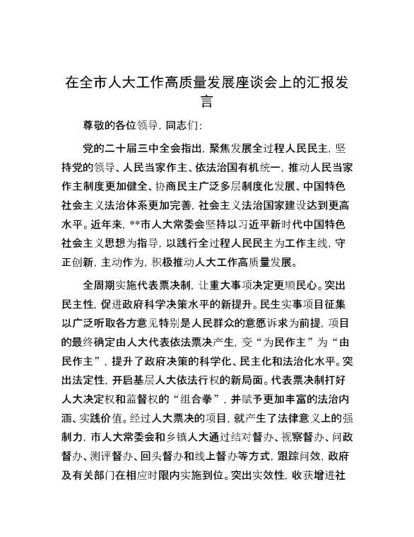 在全市人大工作高质量发展座谈会上的汇报发言 2024-10-15 Word模板 91 购买前,请一定要先点击这里看看,欢迎持续关注,精彩模板每天推送 预览结束,本文件为word文档,一共5页,共2127字,请购买后,下载后查看 购买前,请一定要先点击这里看看,欢迎持续关注,精彩模板每天推送 资源下载下载价格29 RMBVIP免费升级VIP点击检测网盘有效后购买有任何充值和下载问题请加微信:xuexixuexi66 0 演讲发言