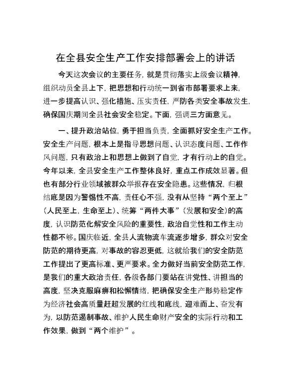 在全县安全生产工作安排部署会上的讲话 2024-10-15 Word模板 134 购买前,请一定要先点击这里看看,欢迎持续关注,精彩模板每天推送 预览结束,本文件为word文档,一共5页,共2217字,请购买后,下载后查看 购买前,请一定要先点击这里看看,欢迎持续关注,精彩模板每天推送 资源下载下载价格29 RMBVIP免费升级VIP点击检测网盘有效后购买有任何充值和下载问题请加微信:xuexixuexi66 0 演讲发言