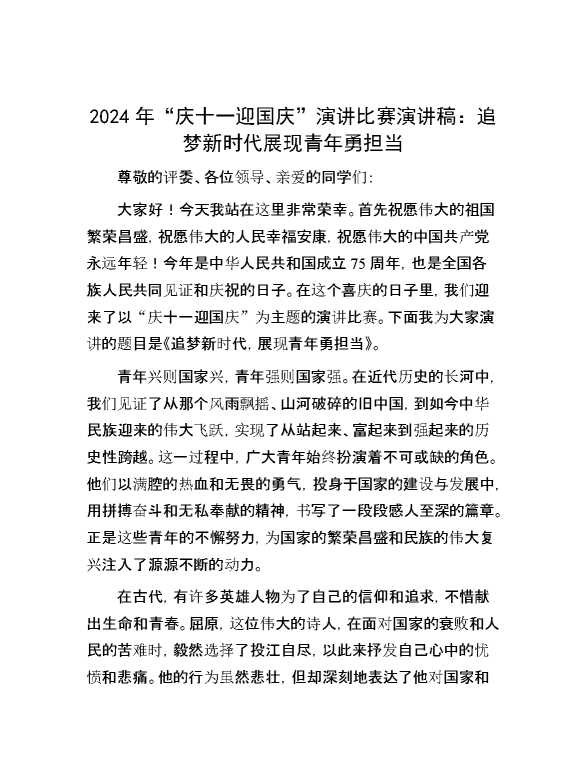 2024年“庆十一迎国庆”演讲比赛演讲稿:追梦新时代 展现青年勇担当 2024-10-15 Word模板 98 购买前,请一定要先点击这里看看,欢迎持续关注,精彩模板每天推送 预览结束,本文件为word文档,一共5页,共2122字,请购买后,下载后查看 购买前,请一定要先点击这里看看,欢迎持续关注,精彩模板每天推送 资源下载下载价格29 RMBVIP免费升级VIP点击检测网盘有效后购买有任何充值和下载问题请加微信:xuexixuexi66 0 演讲发言