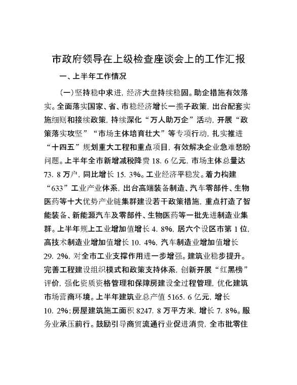 市政府领导在上级检查座谈会上的工作汇报 2024-10-21 Word模板 79 购买前,请一定要先点击这里看看,欢迎持续关注,精彩模板每天推送 预览结束,本文件为word文档,一共7页,共3627字,请购买后,下载后查看 购买前,请一定要先点击这里看看,欢迎持续关注,精彩模板每天推送 资源下载下载价格29 RMBVIP免费升级VIP点击检测网盘有效后购买有任何充值和下载问题请加微信:xuexixuexi66 0 总结汇报