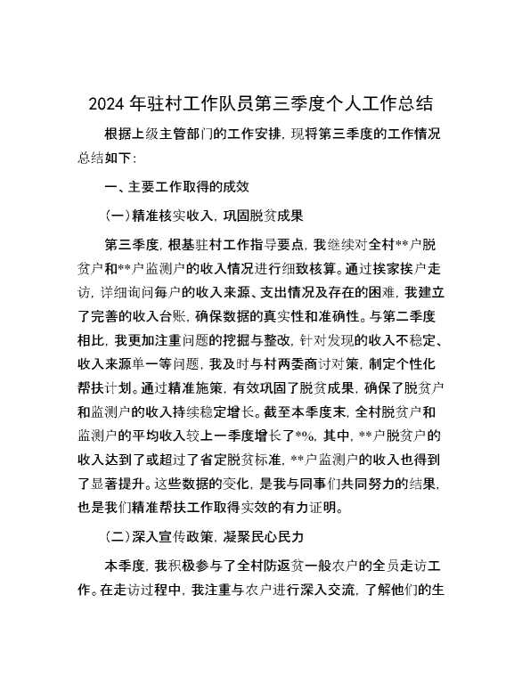 2024年驻村工作队员第三季度个人工作总结 2024-10-21 Word模板 113 购买前,请一定要先点击这里看看,欢迎持续关注,精彩模板每天推送 预览结束,本文件为word文档,一共6页,共2238字,请购买后,下载后查看 购买前,请一定要先点击这里看看,欢迎持续关注,精彩模板每天推送 资源下载下载价格29 RMBVIP免费升级VIP点击检测网盘有效后购买有任何充值和下载问题请加微信:xuexixuexi66 0 总结汇报