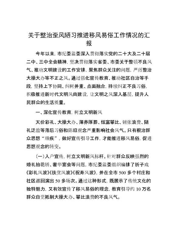 关于整治歪风陋习推进移风易俗工作情况的汇报 2024-10-21 Word模板 85 购买前,请一定要先点击这里看看,欢迎持续关注,精彩模板每天推送 预览结束,本文件为word文档,一共6页,共2817字,请购买后,下载后查看 购买前,请一定要先点击这里看看,欢迎持续关注,精彩模板每天推送 资源下载下载价格29 RMBVIP免费升级VIP点击检测网盘有效后购买有任何充值和下载问题请加微信:xuexixuexi66 0 总结汇报