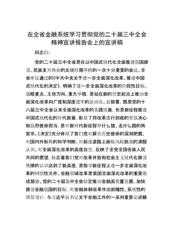 在全省金融系统学习贯彻党的二十届三中全会精神宣讲报告会上的宣讲稿 2024-10-21 Word模板 95 购买前,请一定要先点击这里看看,欢迎持续关注,精彩模板每天推送 预览结束,本文件为word文档,一共8页,共3654字,请购买后,下载后查看 购买前,请一定要先点击这里看看,欢迎持续关注,精彩模板每天推送 资源下载下载价格29 RMBVIP免费升级VIP点击检测网盘有效后购买有任何充值和下载问题请加微信:xuexixuexi66 0 总结汇报