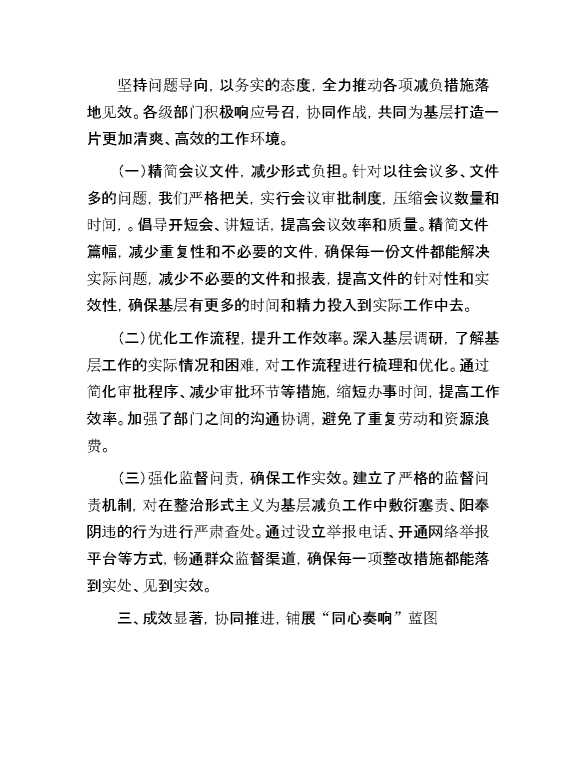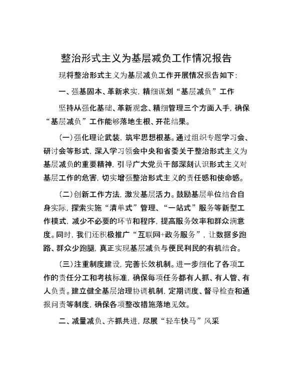 整治形式主义为基层减负工作情况报告 2024-10-21 Word模板 98 购买前,请一定要先点击这里看看,欢迎持续关注,精彩模板每天推送 预览结束,本文件为word文档,一共4页,共1377字,请购买后,下载后查看 购买前,请一定要先点击这里看看,欢迎持续关注,精彩模板每天推送 资源下载下载价格29 RMBVIP免费升级VIP点击检测网盘有效后购买有任何充值和下载问题请加微信:xuexixuexi66 0 总结汇报