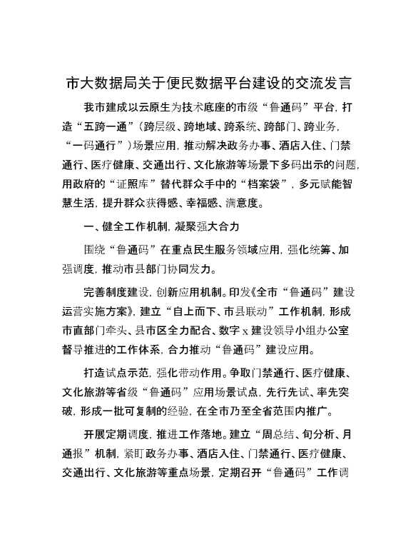 市大数据局关于便民数据平台建设的交流发言 2024-10-22 Word模板 108 购买前,请一定要先点击这里看看,欢迎持续关注,精彩模板每天推送 预览结束,本文件为word文档,一共3页,共1253字,请购买后,下载后查看 购买前,请一定要先点击这里看看,欢迎持续关注,精彩模板每天推送 资源下载下载价格29 RMBVIP免费升级VIP点击检测网盘有效后购买有任何充值和下载问题请加微信:xuexixuexi66 0 演讲发言