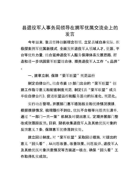 县退役军人事务局领导在拥军优属交流会上的发言 2024-10-22 Word模板 77 购买前,请一定要先点击这里看看,欢迎持续关注,精彩模板每天推送 预览结束,本文件为word文档,一共3页,共1045字,请购买后,下载后查看 购买前,请一定要先点击这里看看,欢迎持续关注,精彩模板每天推送 资源下载下载价格29 RMBVIP免费升级VIP点击检测网盘有效后购买有任何充值和下载问题请加微信:xuexixuexi66 0 演讲发言