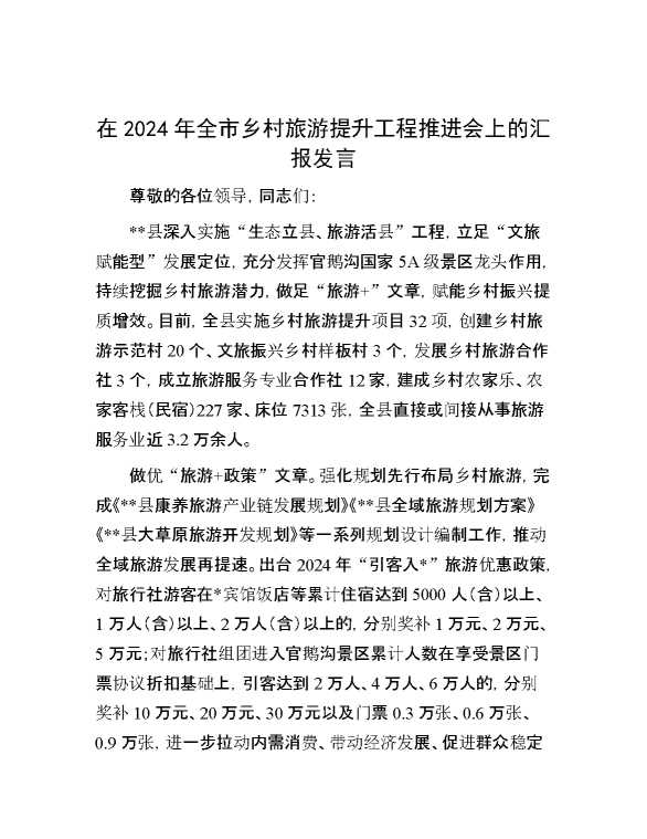 在2024年全市乡村旅游提升工程推进会上的汇报发言 2024-10-22 Word模板 84 购买前,请一定要先点击这里看看,欢迎持续关注,精彩模板每天推送 预览结束,本文件为word文档,一共5页,共2018字,请购买后,下载后查看 购买前,请一定要先点击这里看看,欢迎持续关注,精彩模板每天推送 资源下载下载价格29 RMBVIP免费升级VIP点击检测网盘有效后购买有任何充值和下载问题请加微信:xuexixuexi66 0 演讲发言