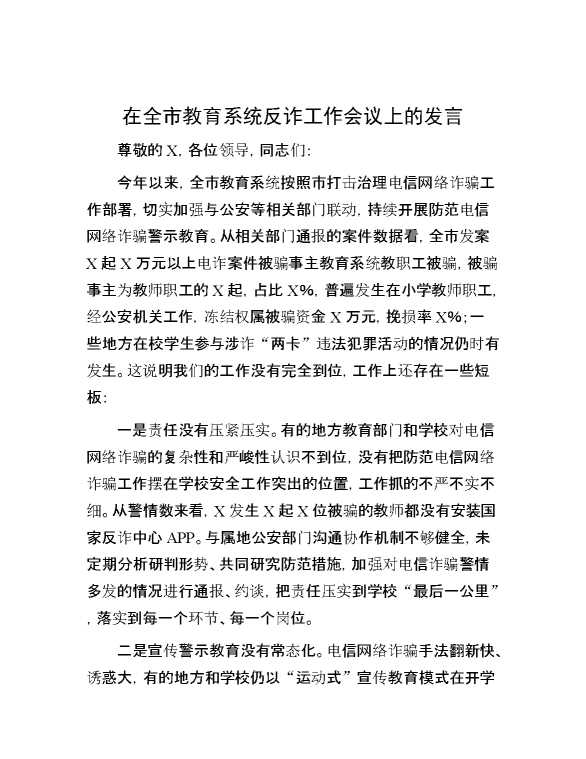 在全市教育系统反诈工作会议上的发言 2024-10-22 Word模板 89 购买前,请一定要先点击这里看看,欢迎持续关注,精彩模板每天推送 预览结束,本文件为word文档,一共4页,共1923字,请购买后,下载后查看 购买前,请一定要先点击这里看看,欢迎持续关注,精彩模板每天推送 资源下载下载价格29 RMBVIP免费升级VIP点击检测网盘有效后购买有任何充值和下载问题请加微信:xuexixuexi66 0 演讲发言