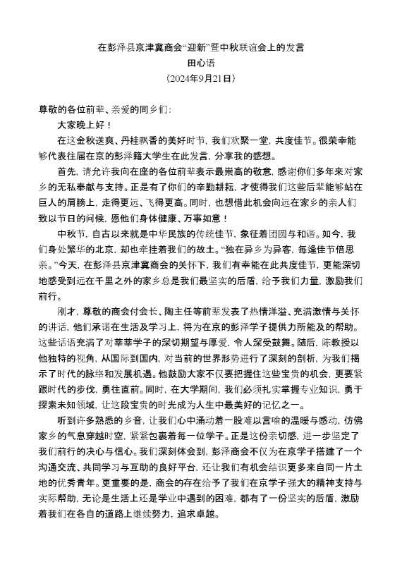 田心语:在彭泽县京津冀商会“迎新”暨中秋联谊会上的发言 2024-10-22 Word模板 75 购买前,请一定要先点击这里看看,欢迎持续关注,精彩模板每天推送 预览结束,本文件为word文档,一共2页,共1278字,请购买后,下载后查看 购买前,请一定要先点击这里看看,欢迎持续关注,精彩模板每天推送 资源下载下载价格29 RMBVIP免费升级VIP点击检测网盘有效后购买有任何充值和下载问题请加微信:xuexixuexi66 0 演讲发言