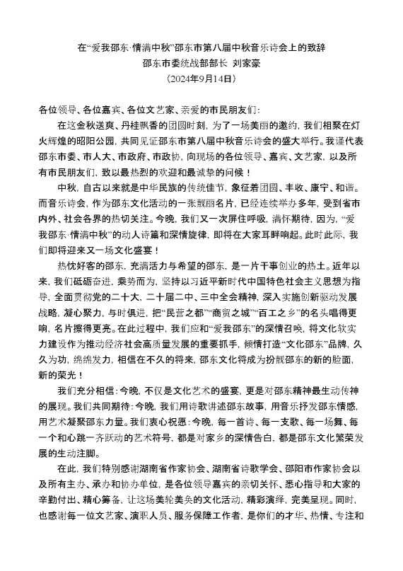 邵东市委统战部部长刘家豪:在“爱我邵东·情满中秋”邵东市第八届中秋音乐诗会上的致辞 2024-10-22 Word模板 73 购买前,请一定要先点击这里看看,欢迎持续关注,精彩模板每天推送 预览结束,本文件为word文档,一共2页,共1045字,请购买后,下载后查看 购买前,请一定要先点击这里看看,欢迎持续关注,精彩模板每天推送 资源下载下载价格29 RMBVIP免费升级VIP点击检测网盘有效后购买有任何充值和下载问题请加微信:xuexixuexi66 0 演讲发言