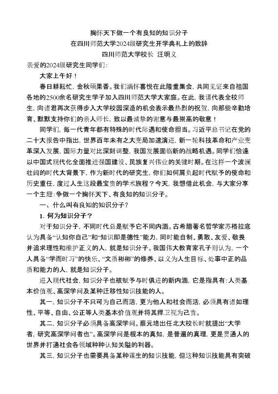 在四川师范大学2024级研究生开学典礼上的致辞:胸怀天下做一个有良知的知识分子 2024-10-22 Word模板 83 购买前,请一定要先点击这里看看,欢迎持续关注,精彩模板每天推送 预览结束,本文件为word文档,一共5页,共4142字,请购买后,下载后查看 购买前,请一定要先点击这里看看,欢迎持续关注,精彩模板每天推送 资源下载下载价格29 RMBVIP免费升级VIP点击检测网盘有效后购买有任何充值和下载问题请加微信:xuexixuexi66 0 演讲发言
