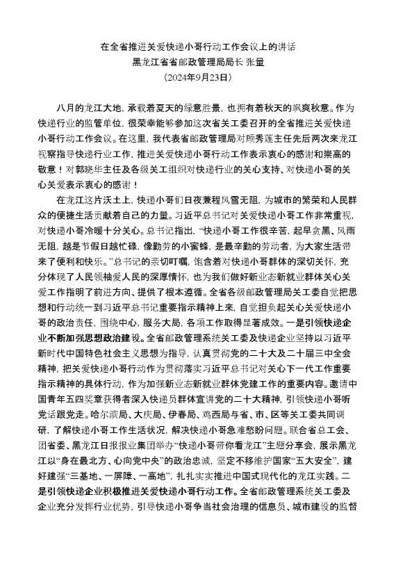 黑龙江省邮政管理局局长张量:在全省推进关爱快递小哥行动工作会议上的讲话 2024-10-22 Word模板 84 购买前,请一定要先点击这里看看,欢迎持续关注,精彩模板每天推送 预览结束,本文件为word文档,一共2页,共1689字,请购买后,下载后查看 购买前,请一定要先点击这里看看,欢迎持续关注,精彩模板每天推送 资源下载下载价格29 RMBVIP免费升级VIP点击检测网盘有效后购买有任何充值和下载问题请加微信:xuexixuexi66 0 演讲发言