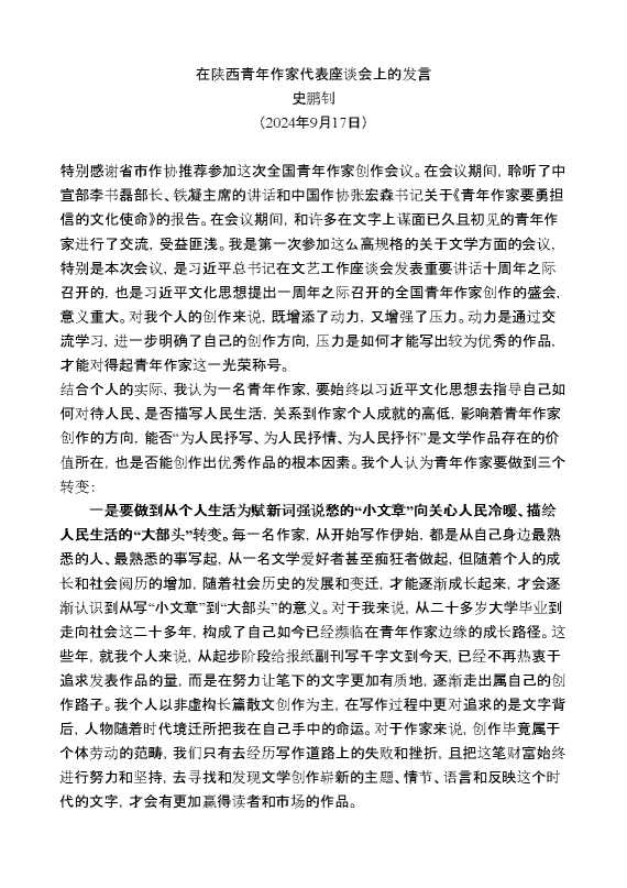 史鹏钊:在陕西青年作家代表座谈会上的发言 2024-10-22 Word模板 80 购买前,请一定要先点击这里看看,欢迎持续关注,精彩模板每天推送 预览结束,本文件为word文档,一共2页,共1521字,请购买后,下载后查看 购买前,请一定要先点击这里看看,欢迎持续关注,精彩模板每天推送 资源下载下载价格29 RMBVIP免费升级VIP点击检测网盘有效后购买有任何充值和下载问题请加微信:xuexixuexi66 0 演讲发言