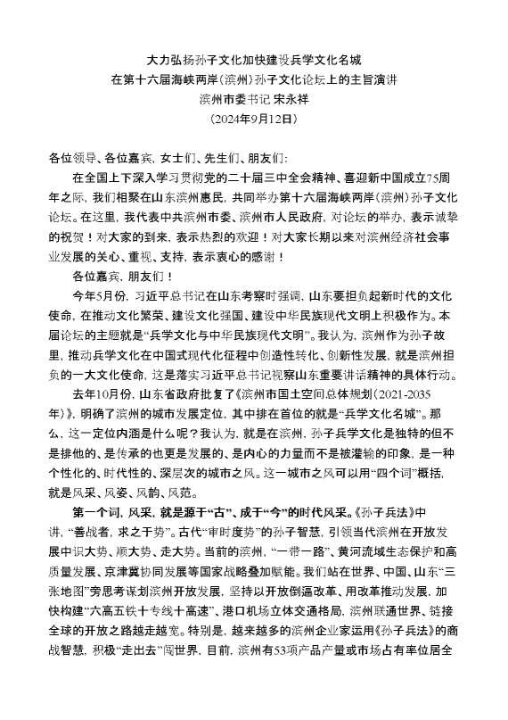 滨州市委书记宋永祥:在第十六届海峡两岸(滨州)孙子文化论坛上的主旨演讲 2024-10-22 Word模板 81 购买前,请一定要先点击这里看看,欢迎持续关注,精彩模板每天推送 预览结束,本文件为word文档,一共3页,共2245字,请购买后,下载后查看 购买前,请一定要先点击这里看看,欢迎持续关注,精彩模板每天推送 资源下载下载价格29 RMBVIP免费升级VIP点击检测网盘有效后购买有任何充值和下载问题请加微信:xuexixuexi66 0 演讲发言