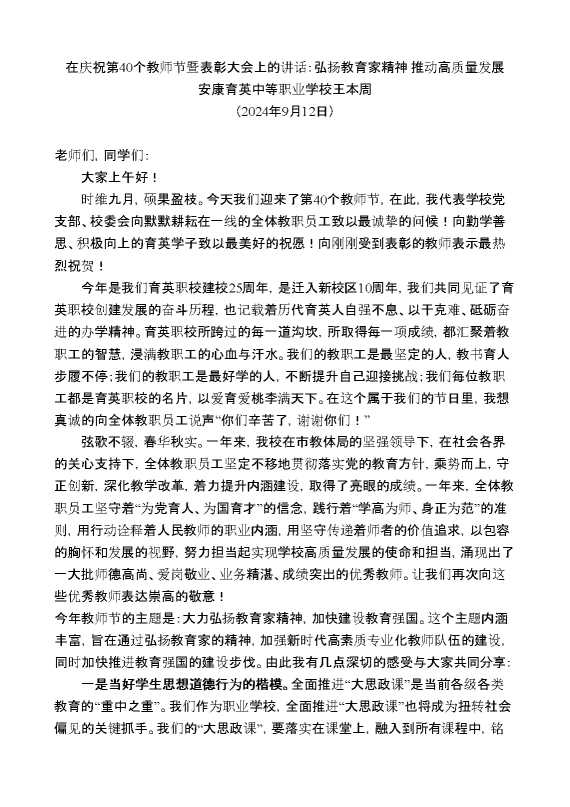 安康育英中等职业学校王本周:在庆祝第40个教师节暨表彰大会上的讲话 2024-10-22 Word模板 73 购买前,请一定要先点击这里看看,欢迎持续关注,精彩模板每天推送 预览结束,本文件为word文档,一共2页,共1508字,请购买后,下载后查看 购买前,请一定要先点击这里看看,欢迎持续关注,精彩模板每天推送 资源下载下载价格29 RMBVIP免费升级VIP点击检测网盘有效后购买有任何充值和下载问题请加微信:xuexixuexi66 0 演讲发言