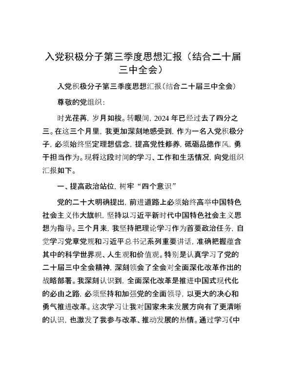 入党积极分子第三季度思想汇报(结合二十届三中全会)【43812】 2024-10-22 Word模板 102 购买前,请一定要先点击这里看看,欢迎持续关注,精彩模板每天推送 预览结束,本文件为word文档,一共4页,共1462字,请购买后,下载后查看 购买前,请一定要先点击这里看看,欢迎持续关注,精彩模板每天推送 资源下载下载价格29 RMBVIP免费升级VIP点击检测网盘有效后购买有任何充值和下载问题请加微信:xuexixuexi66 0 党课及生活会