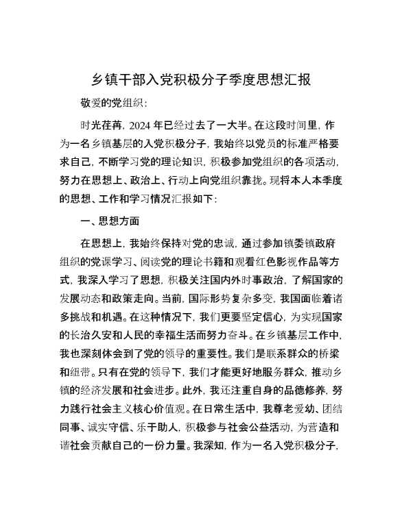 乡镇干部入党积极分子季度思想汇报 2024-10-22 Word模板 89 购买前,请一定要先点击这里看看,欢迎持续关注,精彩模板每天推送 预览结束,本文件为word文档,一共4页,共1829字,请购买后,下载后查看 购买前,请一定要先点击这里看看,欢迎持续关注,精彩模板每天推送 资源下载下载价格29 RMBVIP免费升级VIP点击检测网盘有效后购买有任何充值和下载问题请加微信:xuexixuexi66 0 党课及生活会