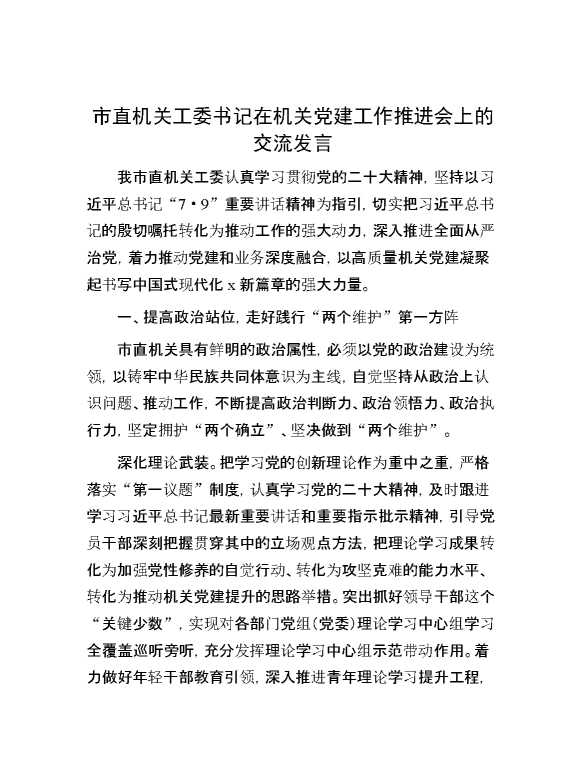 市直机关工委书记在机关党建工作推进会上的交流发言 2024-10-23 Word模板 88 购买前,请一定要先点击这里看看,欢迎持续关注,精彩模板每天推送 预览结束,本文件为word文档,一共5页,共2197字,请购买后,下载后查看 购买前,请一定要先点击这里看看,欢迎持续关注,精彩模板每天推送 资源下载下载价格29 RMBVIP免费升级VIP点击检测网盘有效后购买有任何充值和下载问题请加微信:xuexixuexi66 0 演讲发言