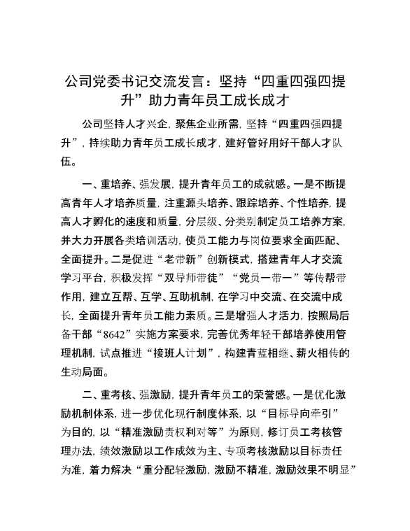 公司党委书记交流发言:坚持“四重四强四提升” 助力青年员工成长成才 2024-10-23 Word模板 79 购买前,请一定要先点击这里看看,欢迎持续关注,精彩模板每天推送 预览结束,本文件为word文档,一共3页,共1150字,请购买后,下载后查看 购买前,请一定要先点击这里看看,欢迎持续关注,精彩模板每天推送 资源下载下载价格29 RMBVIP免费升级VIP点击检测网盘有效后购买有任何充值和下载问题请加微信:xuexixuexi66 0 演讲发言