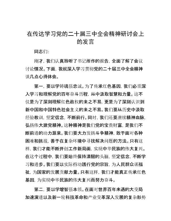 在传达学习党的二十届三中全会精神研讨会上的发言 2024-10-23 Word模板 89 购买前,请一定要先点击这里看看,欢迎持续关注,精彩模板每天推送 预览结束,本文件为word文档,一共5页,共2012字,请购买后,下载后查看 购买前,请一定要先点击这里看看,欢迎持续关注,精彩模板每天推送 资源下载下载价格29 RMBVIP免费升级VIP点击检测网盘有效后购买有任何充值和下载问题请加微信:xuexixuexi66 0 演讲发言