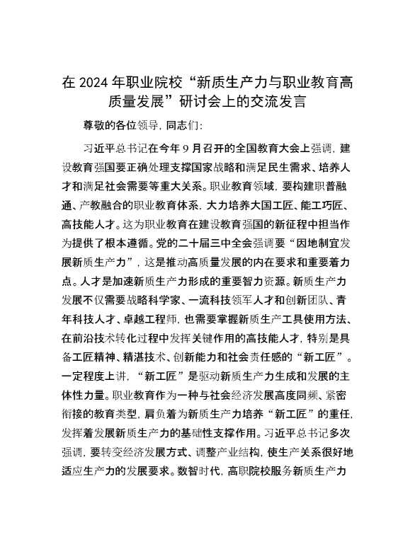 在2024年职业院校“新质生产力与职业教育高质量发展”研讨会上的交流发言 2024-10-23 Word模板 90 购买前,请一定要先点击这里看看,欢迎持续关注,精彩模板每天推送 预览结束,本文件为word文档,一共4页,共1923字,请购买后,下载后查看 购买前,请一定要先点击这里看看,欢迎持续关注,精彩模板每天推送 资源下载下载价格29 RMBVIP免费升级VIP点击检测网盘有效后购买有任何充值和下载问题请加微信:xuexixuexi66 0 演讲发言