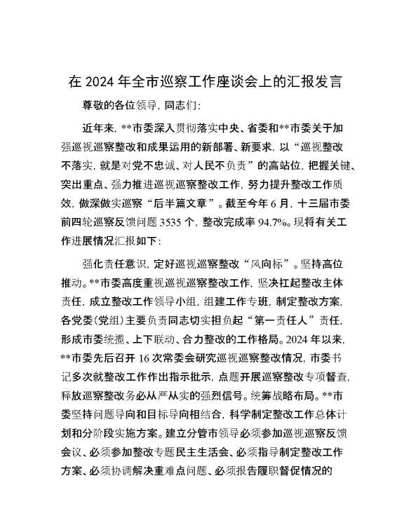 在2024年全市巡察工作座谈会上的汇报发言 2024-10-23 Word模板 97 购买前,请一定要先点击这里看看,欢迎持续关注,精彩模板每天推送 预览结束,本文件为word文档,一共3页,共1425字,请购买后,下载后查看 购买前,请一定要先点击这里看看,欢迎持续关注,精彩模板每天推送 资源下载下载价格29 RMBVIP免费升级VIP点击检测网盘有效后购买有任何充值和下载问题请加微信:xuexixuexi66 0 演讲发言