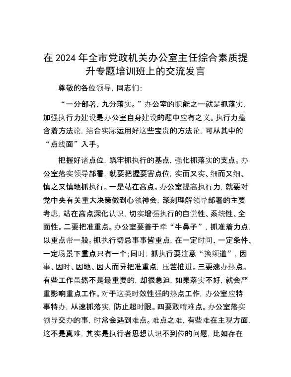 在2024年全市党政机关办公室主任综合素质提升专题培训班上的交流发言 2024-10-23 Word模板 82 购买前,请一定要先点击这里看看,欢迎持续关注,精彩模板每天推送 预览结束,本文件为word文档,一共5页,共2194字,请购买后,下载后查看 购买前,请一定要先点击这里看看,欢迎持续关注,精彩模板每天推送 资源下载下载价格29 RMBVIP免费升级VIP点击检测网盘有效后购买有任何充值和下载问题请加微信:xuexixuexi66 0 演讲发言
