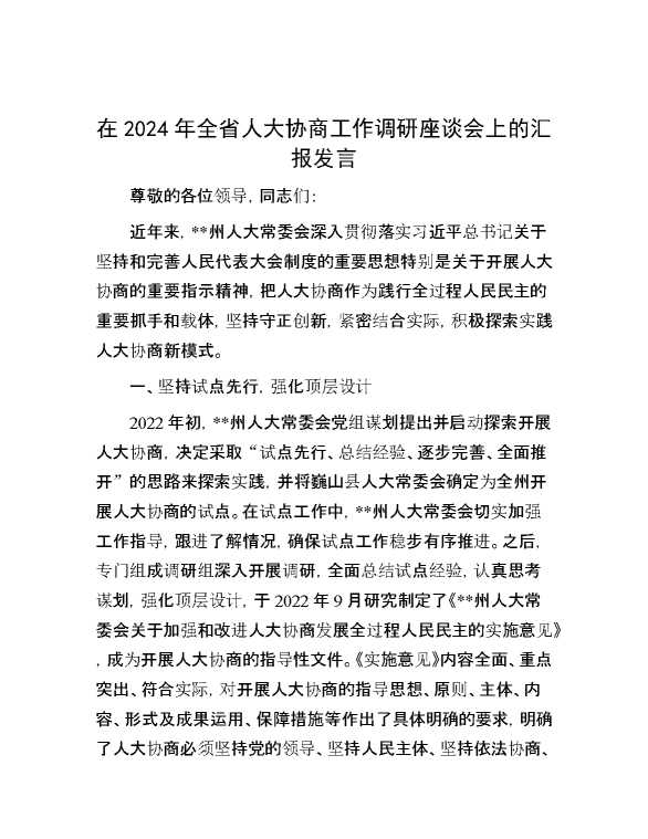 在2024年全省人大协商工作调研座谈会上的汇报发言 2024-10-23 Word模板 87 购买前,请一定要先点击这里看看,欢迎持续关注,精彩模板每天推送 预览结束,本文件为word文档,一共7页,共3374字,请购买后,下载后查看 购买前,请一定要先点击这里看看,欢迎持续关注,精彩模板每天推送 资源下载下载价格29 RMBVIP免费升级VIP点击检测网盘有效后购买有任何充值和下载问题请加微信:xuexixuexi66 0 演讲发言