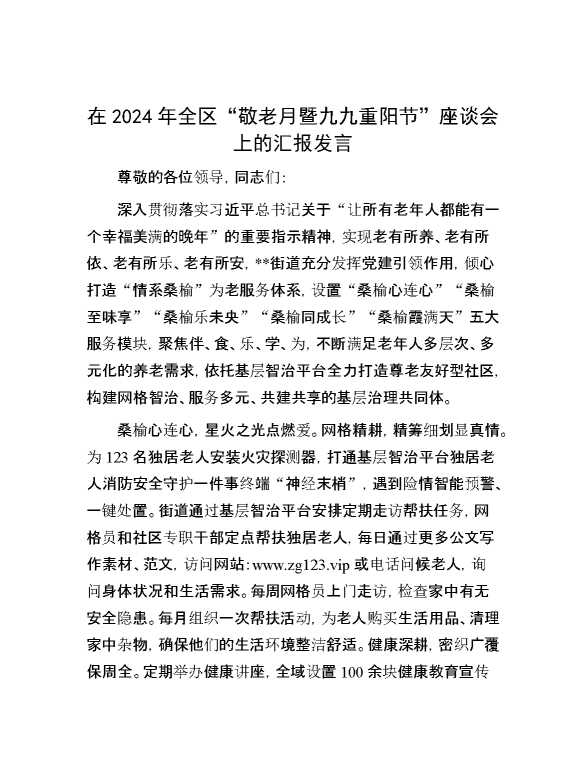 在2024年全区“敬老月暨九九重阳节”座谈会上的汇报发言 2024-10-23 Word模板 83 购买前,请一定要先点击这里看看,欢迎持续关注,精彩模板每天推送 预览结束,本文件为word文档,一共5页,共2463字,请购买后,下载后查看 购买前,请一定要先点击这里看看,欢迎持续关注,精彩模板每天推送 资源下载下载价格29 RMBVIP免费升级VIP点击检测网盘有效后购买有任何充值和下载问题请加微信:xuexixuexi66 0 演讲发言