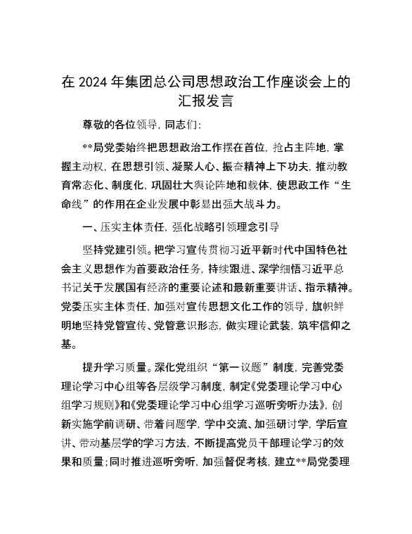 在2024年集团总公司思想政治工作座谈会上的汇报发言 2024-10-23 Word模板 82 购买前,请一定要先点击这里看看,欢迎持续关注,精彩模板每天推送 预览结束,本文件为word文档,一共3页,共1375字,请购买后,下载后查看 购买前,请一定要先点击这里看看,欢迎持续关注,精彩模板每天推送 资源下载下载价格29 RMBVIP免费升级VIP点击检测网盘有效后购买有任何充值和下载问题请加微信:xuexixuexi66 0 演讲发言