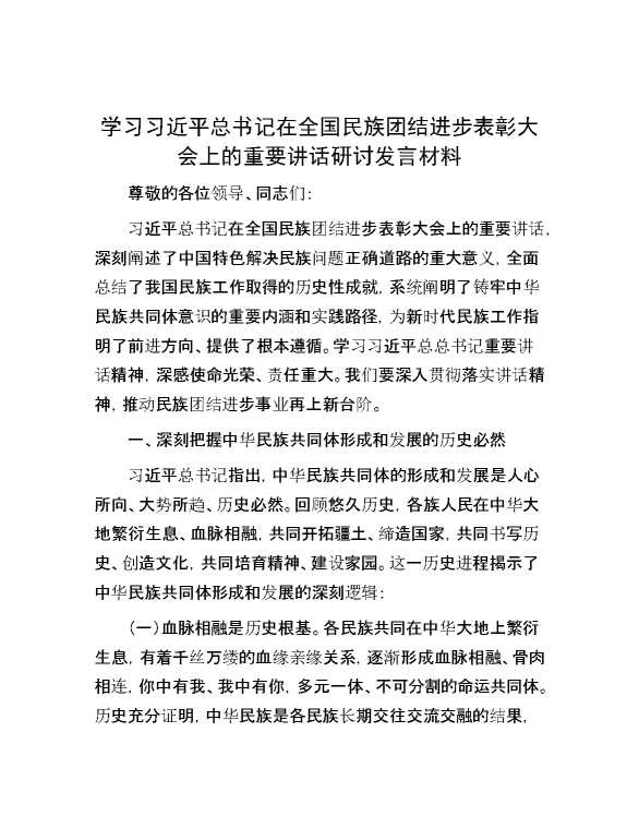 学习习近平总书记在全国民族团结进步表彰大会上的重要讲话研讨发言材料 2024-10-23 Word模板 80 购买前,请一定要先点击这里看看,欢迎持续关注,精彩模板每天推送 预览结束,本文件为word文档,一共6页,共2535字,请购买后,下载后查看 购买前,请一定要先点击这里看看,欢迎持续关注,精彩模板每天推送 资源下载下载价格29 RMBVIP免费升级VIP点击检测网盘有效后购买有任何充值和下载问题请加微信:xuexixuexi66 0 演讲发言