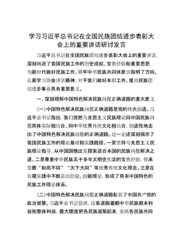 学习习近平总书记在全国民族团结进步表彰大会上的重要讲话研讨发言 2024-10-23 Word模板 80 购买前,请一定要先点击这里看看,欢迎持续关注,精彩模板每天推送 预览结束,本文件为word文档,一共5页,共2299字,请购买后,下载后查看 购买前,请一定要先点击这里看看,欢迎持续关注,精彩模板每天推送 资源下载下载价格29 RMBVIP免费升级VIP点击检测网盘有效后购买有任何充值和下载问题请加微信:xuexixuexi66 0 演讲发言
