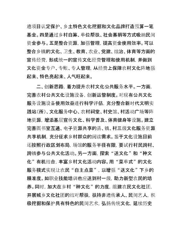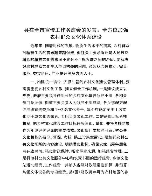 县在全市宣传工作务虚会的发言:全方位加强农村群众文化体系建设 2024-10-23 Word模板 91 购买前,请一定要先点击这里看看,欢迎持续关注,精彩模板每天推送 预览结束,本文件为word文档,一共4页,共2018字,请购买后,下载后查看 购买前,请一定要先点击这里看看,欢迎持续关注,精彩模板每天推送 资源下载下载价格29 RMBVIP免费升级VIP点击检测网盘有效后购买有任何充值和下载问题请加微信:xuexixuexi66 0 演讲发言