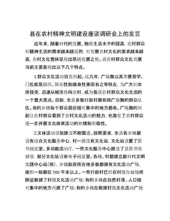 县在农村精神文明建设座谈调研会上的发言 2024-10-23 Word模板 79 购买前,请一定要先点击这里看看,欢迎持续关注,精彩模板每天推送 预览结束,本文件为word文档,一共5页,共2246字,请购买后,下载后查看 购买前,请一定要先点击这里看看,欢迎持续关注,精彩模板每天推送 资源下载下载价格29 RMBVIP免费升级VIP点击检测网盘有效后购买有任何充值和下载问题请加微信:xuexixuexi66 0 演讲发言