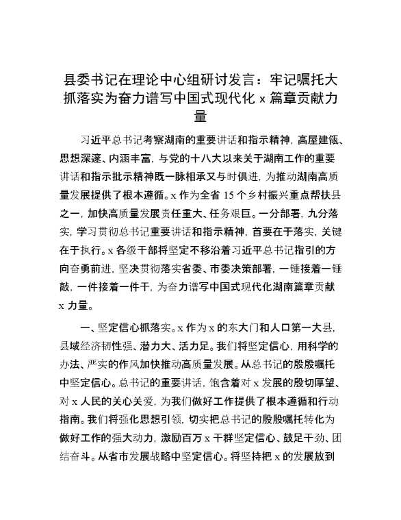 县委书记在理论中心组研讨发言:牢记嘱托 大抓落实 为奋力谱写中国式现代化x篇章贡献力量 2024-10-23 Word模板 82 购买前,请一定要先点击这里看看,欢迎持续关注,精彩模板每天推送 预览结束,本文件为word文档,一共5页,共2235字,请购买后,下载后查看 购买前,请一定要先点击这里看看,欢迎持续关注,精彩模板每天推送 资源下载下载价格29 RMBVIP免费升级VIP点击检测网盘有效后购买有任何充值和下载问题请加微信:xuexixuexi66 0 演讲发言