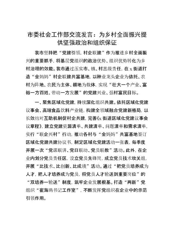市委社会工作部交流发言:为乡村全面振兴提供坚强政治和组织保证 2024-10-23 Word模板 78 购买前,请一定要先点击这里看看,欢迎持续关注,精彩模板每天推送 预览结束,本文件为word文档,一共3页,共1007字,请购买后,下载后查看 购买前,请一定要先点击这里看看,欢迎持续关注,精彩模板每天推送 资源下载下载价格29 RMBVIP免费升级VIP点击检测网盘有效后购买有任何充值和下载问题请加微信:xuexixuexi66 0 演讲发言