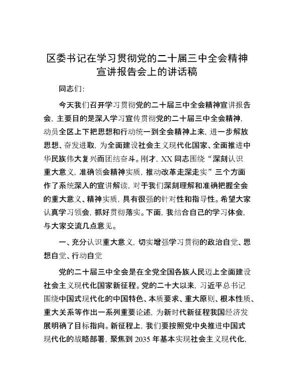 区委书记在学习贯彻党的二十届三中全会精神宣讲报告会上的讲话稿 2024-10-23 Word模板 80 购买前,请一定要先点击这里看看,欢迎持续关注,精彩模板每天推送 预览结束,本文件为word文档,一共5页,共2148字,请购买后,下载后查看 购买前,请一定要先点击这里看看,欢迎持续关注,精彩模板每天推送 资源下载下载价格29 RMBVIP免费升级VIP点击检测网盘有效后购买有任何充值和下载问题请加微信:xuexixuexi66 0 演讲发言