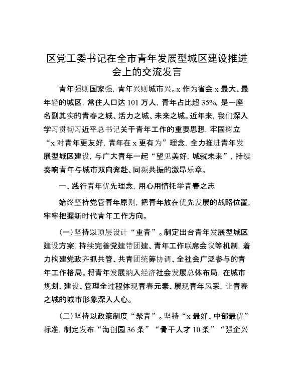 区党工委书记在全市青年发展型城区建设推进会上的交流发言 2024-10-23 Word模板 83 购买前,请一定要先点击这里看看,欢迎持续关注,精彩模板每天推送 预览结束,本文件为word文档,一共4页,共1741字,请购买后,下载后查看 购买前,请一定要先点击这里看看,欢迎持续关注,精彩模板每天推送 资源下载下载价格29 RMBVIP免费升级VIP点击检测网盘有效后购买有任何充值和下载问题请加微信:xuexixuexi66 0 演讲发言