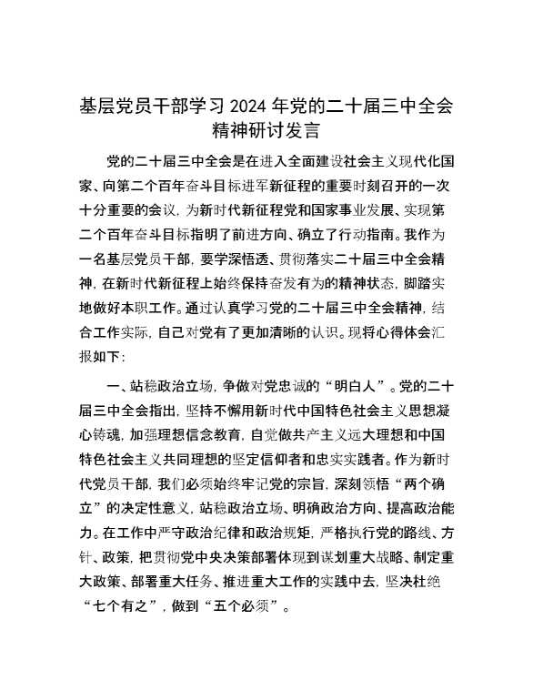 基层党员干部学习2024年党的二十届三中全会精神研讨发言 2024-10-23 Word模板 74 购买前,请一定要先点击这里看看,欢迎持续关注,精彩模板每天推送 预览结束,本文件为word文档,一共4页,共1605字,请购买后,下载后查看 购买前,请一定要先点击这里看看,欢迎持续关注,精彩模板每天推送 资源下载下载价格29 RMBVIP免费升级VIP点击检测网盘有效后购买有任何充值和下载问题请加微信:xuexixuexi66 0 演讲发言